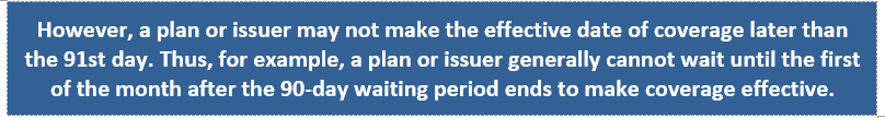 Under the ACA, a group health plan and a health insurance issuer offering group health insurance coverage may not apply a waiting period that exceeds 90 days. Thus, after an individual is determined to be otherwise eligible for coverage under the terms of the plan, any waiting period may not extend beyond 90 days. All calendar days are counted beginning on the enrollment date, including weekends and holidays.