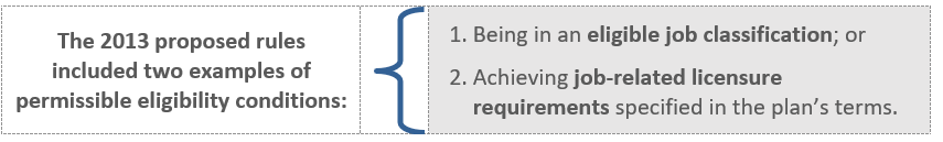 The final rules add a third example of permissible eligibility conditions, allowing the satisfaction of a reasonable and bona fide employment-based orientation period.