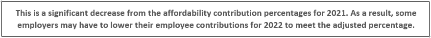 The updated affordability percentages are effective for taxable years and plan years beginning Jan. 1, 2022. This is a significant decrease from the affordability contribution percentages for 2021, which were set at 9.83%and 8.27%. As a result, some employers may have to lower their employee contributions for 2022 to meet the adjusted percentage.